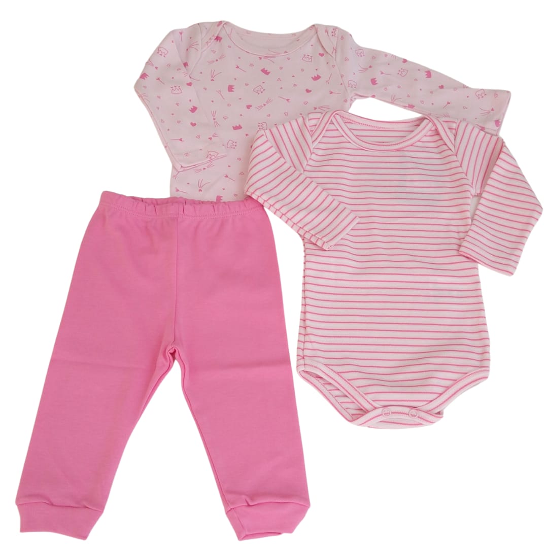 Kit conjunto body 3 peças, ele é composto por um body manga longa estampado de princesa na cor rosa desenvolvido em 100% algodão